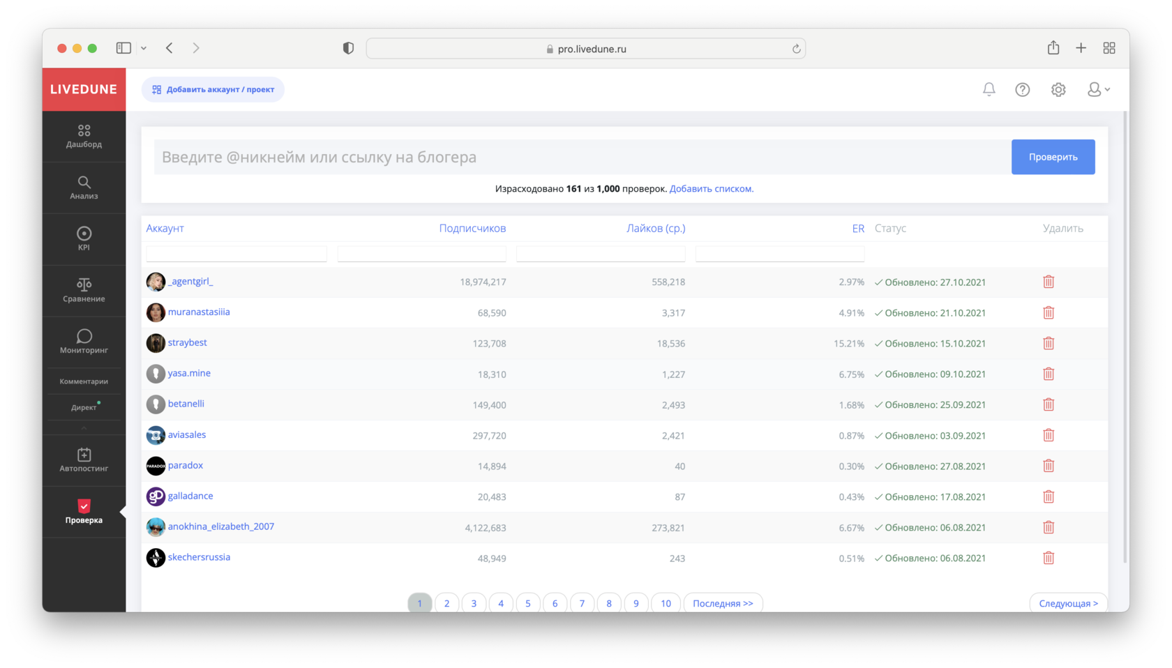 Получить ответ на вопрос «Крутит блогер в Инстаграм свой аккаунт или нет?» можно быстро и недорого в LiveDune с помощью инструмента «Проверка блогеров». Этот инструмент впитал в себя все данные, которые мы знаем о блогерах Инстаграм и то, как наши пользователи проверяют их на накрутки.