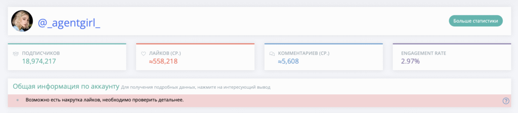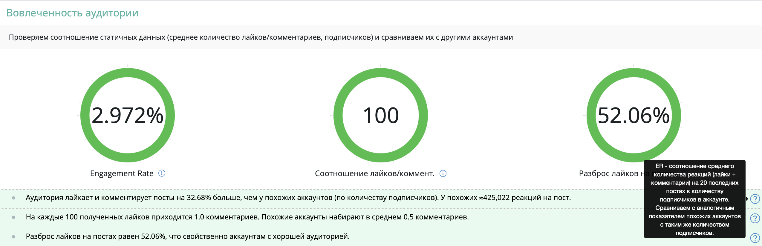 ER (Engagement Rate) ― соотношение среднего количества лайков и комментариев к количеству подписчиков. Сервис сравнивает ER анализируемого аккаунта со средним ER похожих аккаунтов по количеству подписчиков. Если разница большая ― стоит насторожиться, возможно, в аккаунте плохой контент или были докуплены подписчики.
