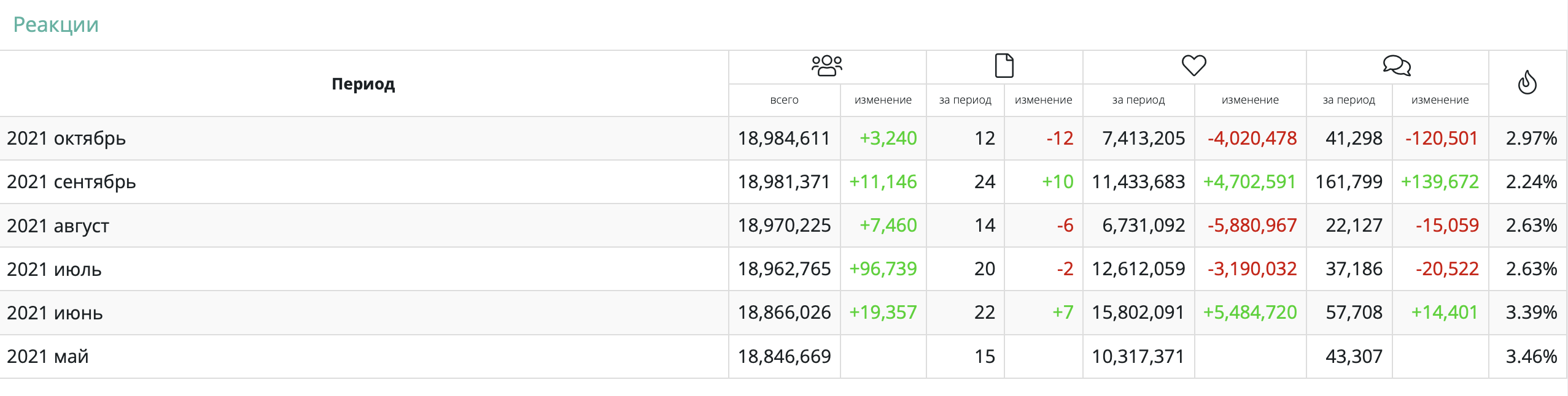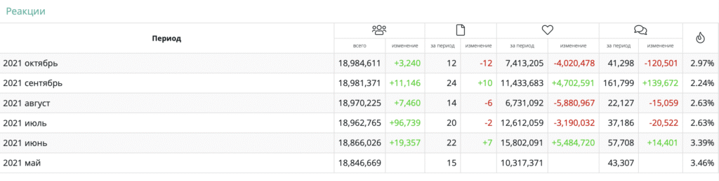 - В блоке «Реакции» сравниваются показатели аккаунта за разные месяцы: