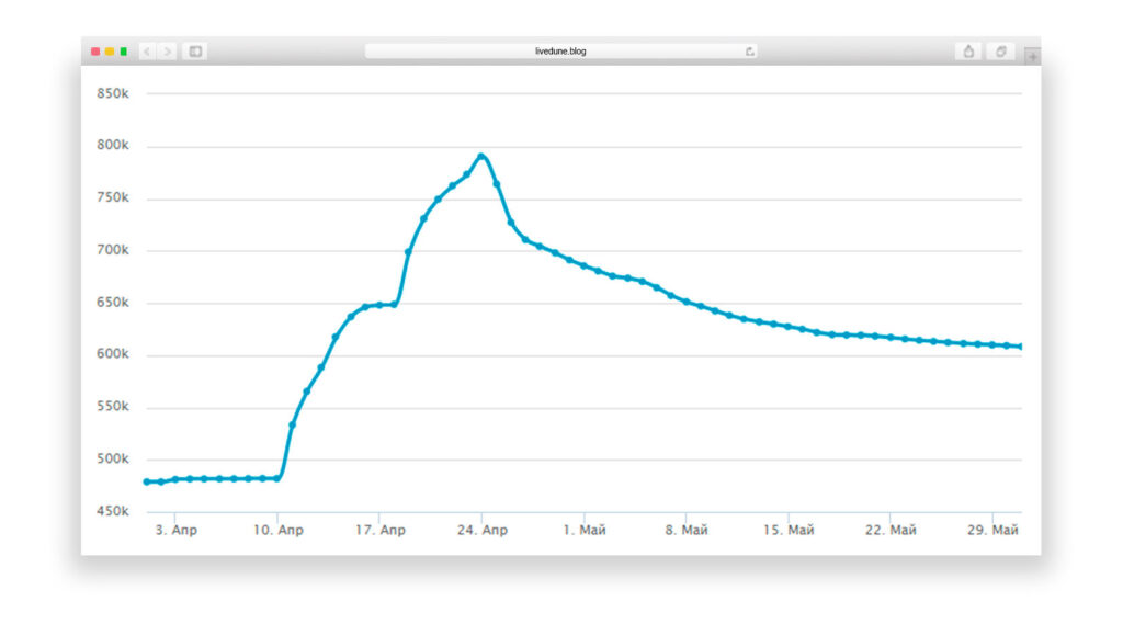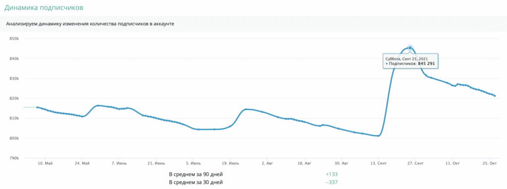 Стоимость рекламы практически в любом аккаунте составляется из трёх величин: количество подписчиков, лайков и комментариев. Первая отвечает за размер аудитории, а оставшиеся за её активность. Аккаунт с 600К подписчиков и 30К лайков на каждом посте выглядит вкусно для рекламодателя. Необязательно знать, кто из этих 600К подписчиков и кто ставит эти лайки. Зачастую достаточно лишь динамики. Например, динамика подписчиков: