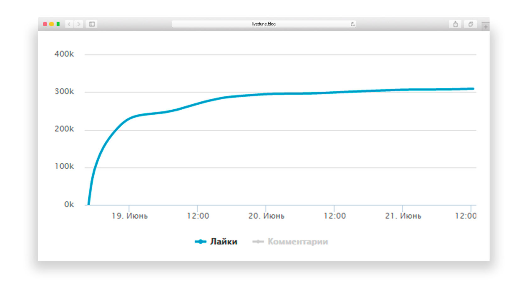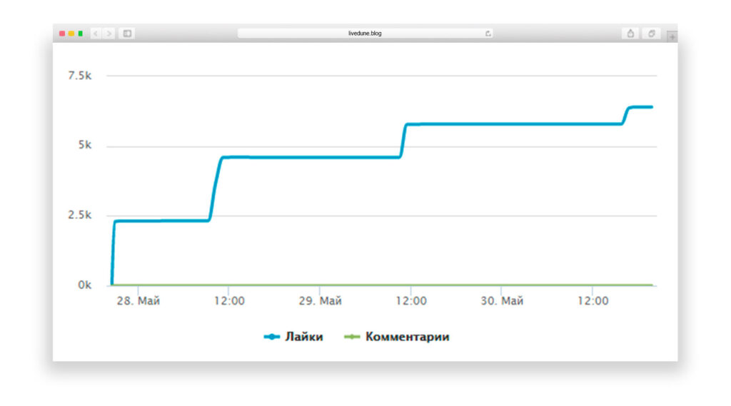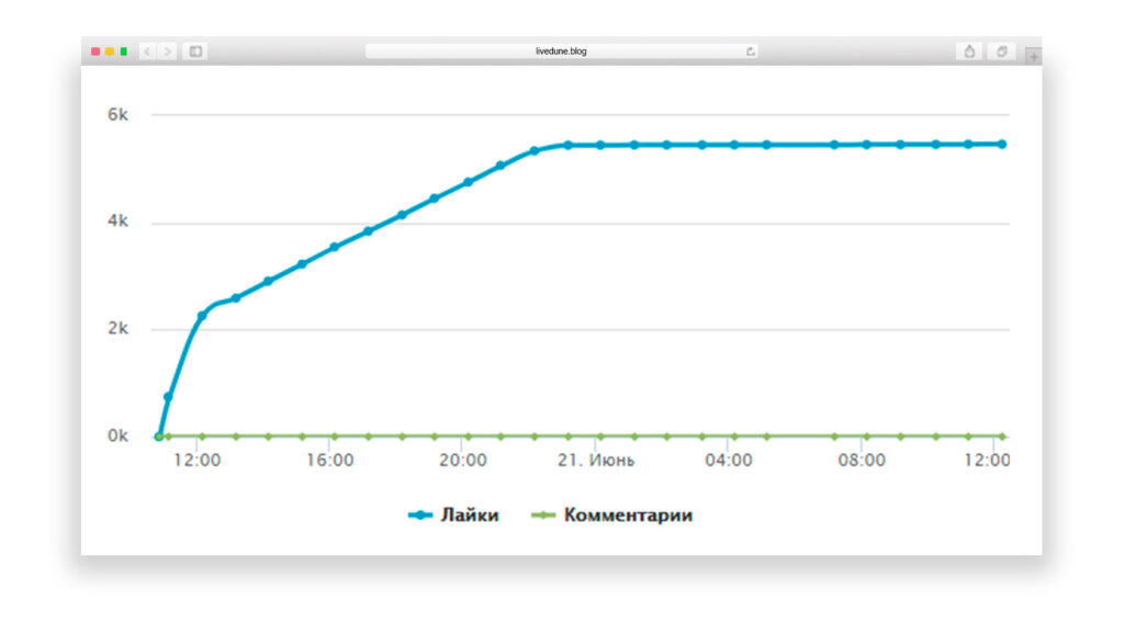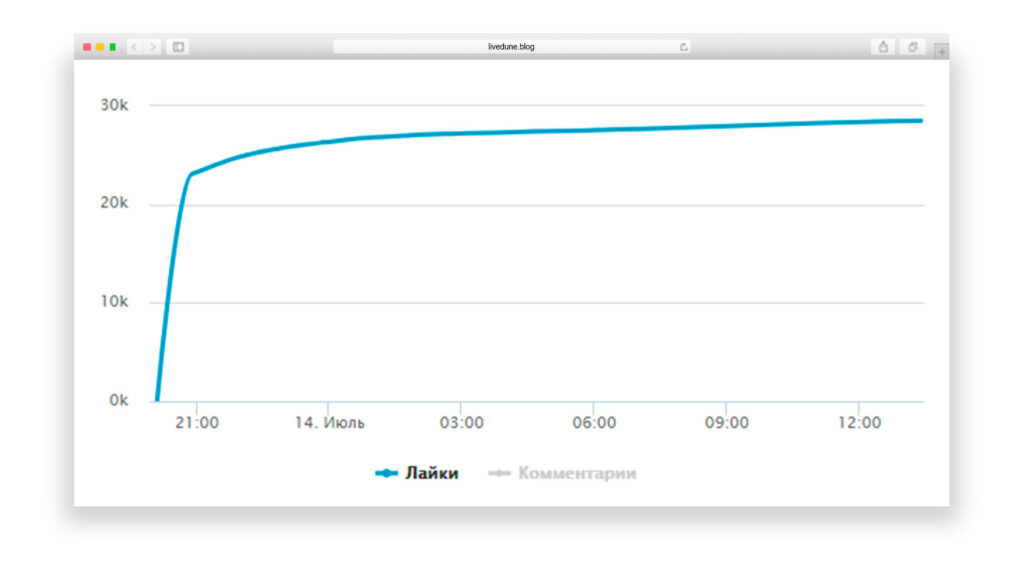 Вернёмся на шаг назад, к предыдущему графику с резким ростом в первый час. Главное, что на нем видно — уголок примерно в 21 час – это тот момент, когда перестали закупаться лайки. Сравните со вторым графиком, он весь плавный и не имеет углов. Или вот такой пример: