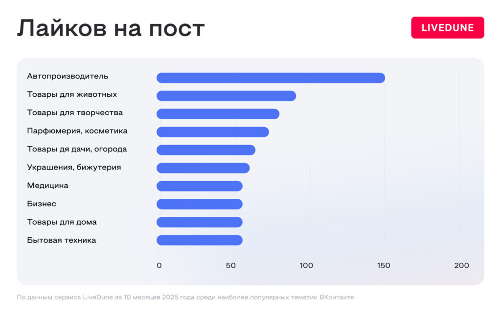 Второе место заняли товары для животных, набирающие по 89 лайков на пост. Можно было даже не смотреть, что в самом залайканном посте (но мы посмотрели) – конечно же, там котик. Хотя дальше есть и всякая экзотика. Например, 35 тысяч лайков собрало видео с геккончиками из магазина для любителей террариумов. В общем, животные – вечная тема для интернета, и в 2025 году она продолжает оставаться в лидерах.