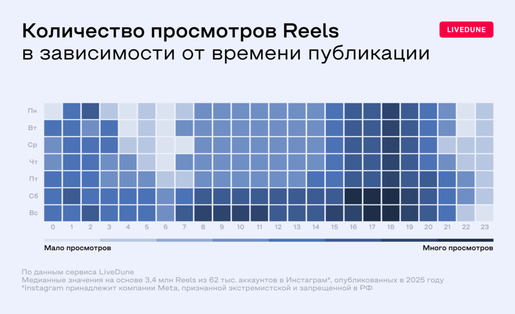Какое время для публикации рилс в Инстаграм* самое оптимальное? И влияют ли вообще день недели и время выхода на дальнейшую судьбу рилса в алгоритмической ленте? Сервис управления соцсетями LiveDune узнал ответ на этот вопрос привычным способом – при помощи статистики и аналитики. И спросил SMM-экспертов, что они об этом думают.