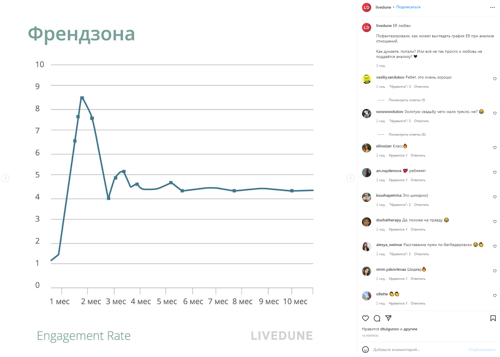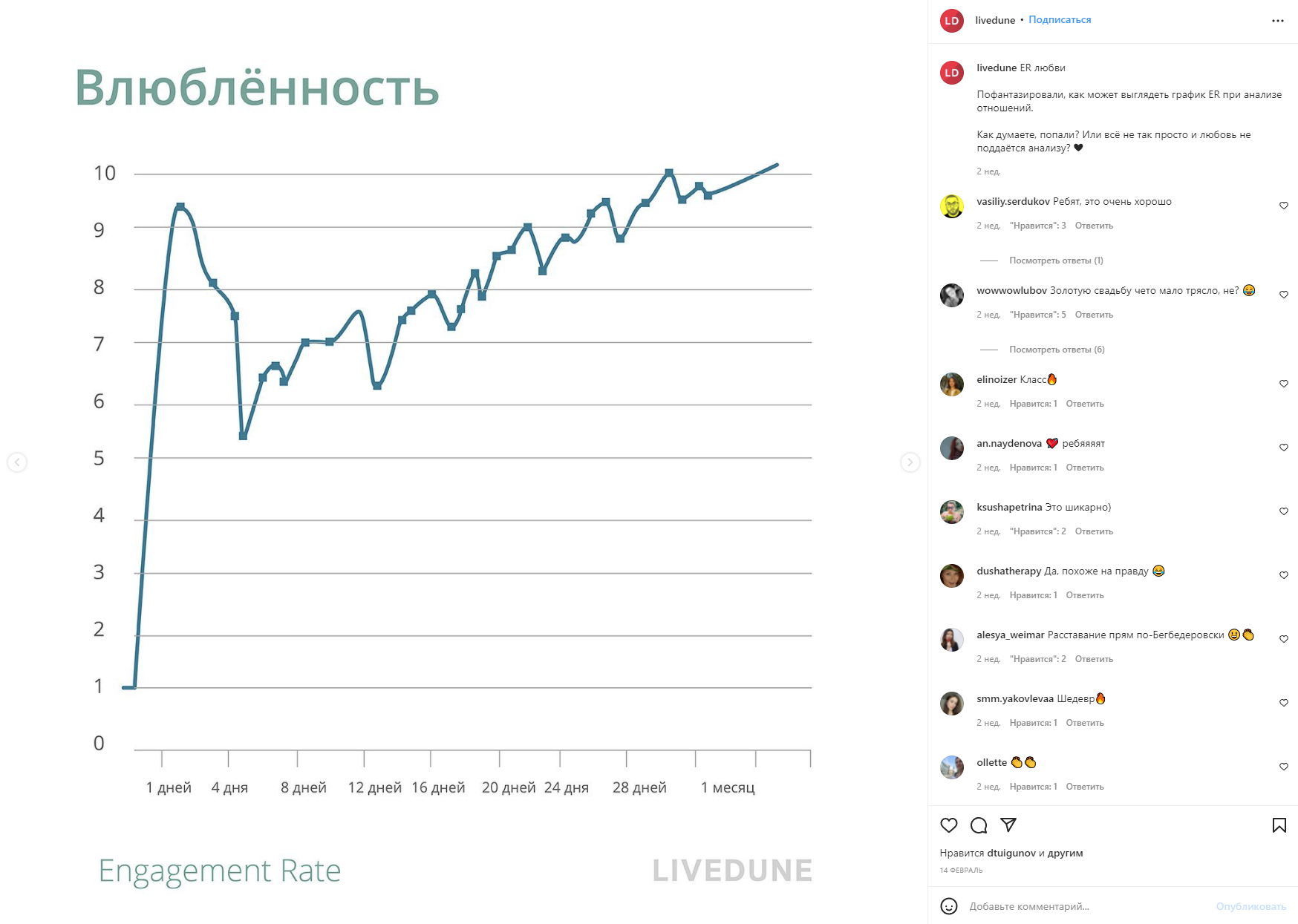 В канун Дня святого Валентина LiveDune решил сделать небольшой проект для соцсетей. Отказавшись от банальных открыток и акций, мы постарались совместить, на первый взгляд, несовместимое ― аналитику и любовь. Так родился проект «Что если бы отношения были графиками ER?».