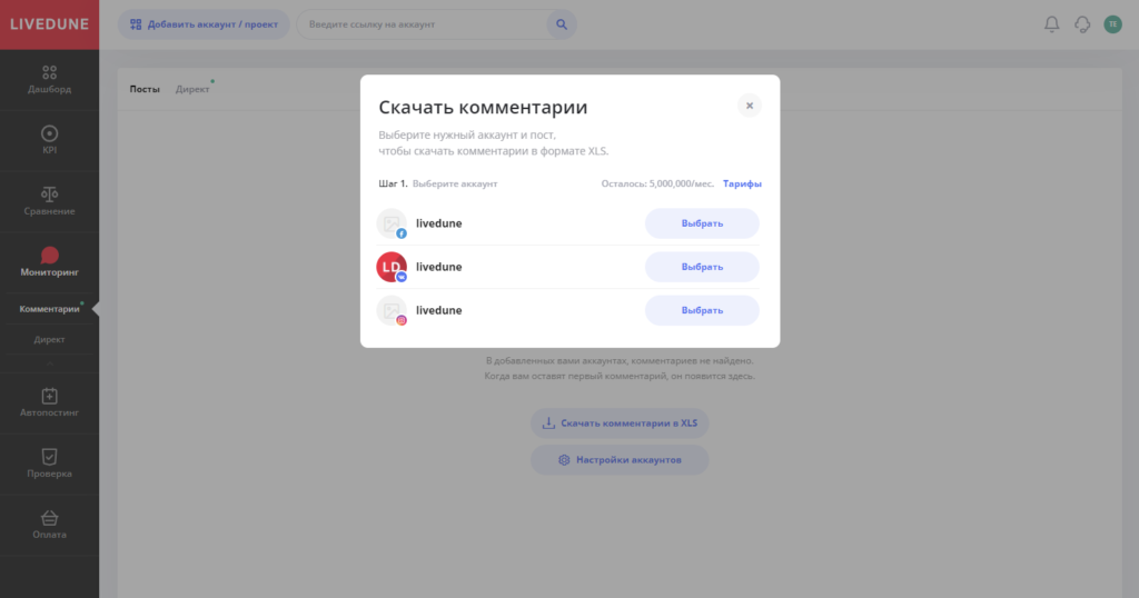 Для начала зарегистрируйтесть в LiveDune и добавьте на Дашборд аккаунт из которого нужно выгрузить комментарии. Далее перейдите в модуль «Мониторинг» ― «Комментарии». Нажмите «Скачать комментарии в XLS».