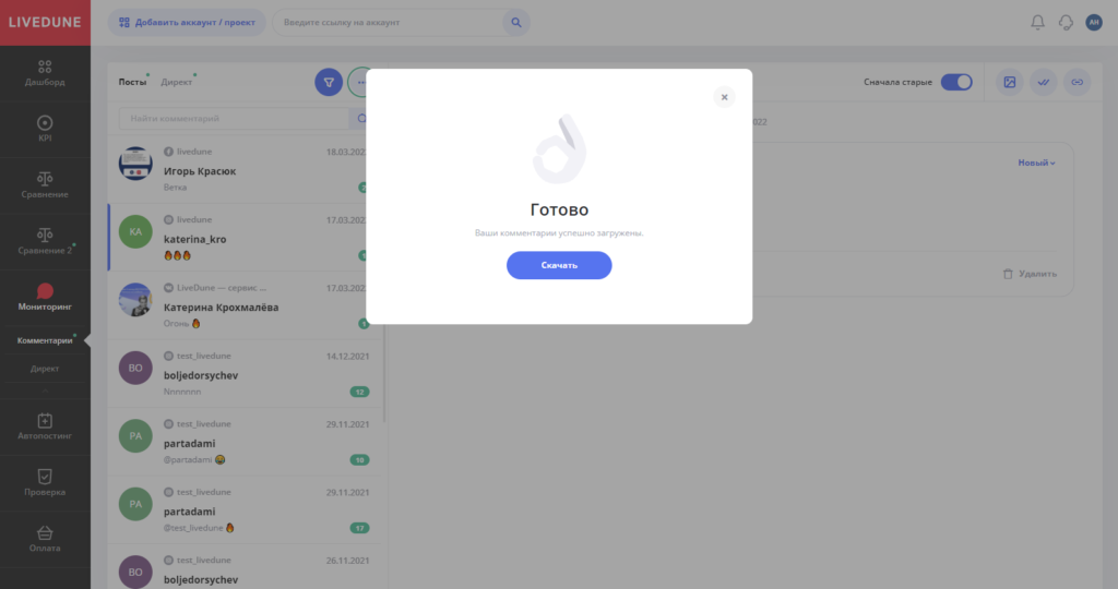 Выгрузка комментариев входит во все тарифные планы LiveDune. Количество комментариев, доступных к скачиванию, зависит от выбранного тарифа. Во время пробного периода выгрузка комментариев недоступна.