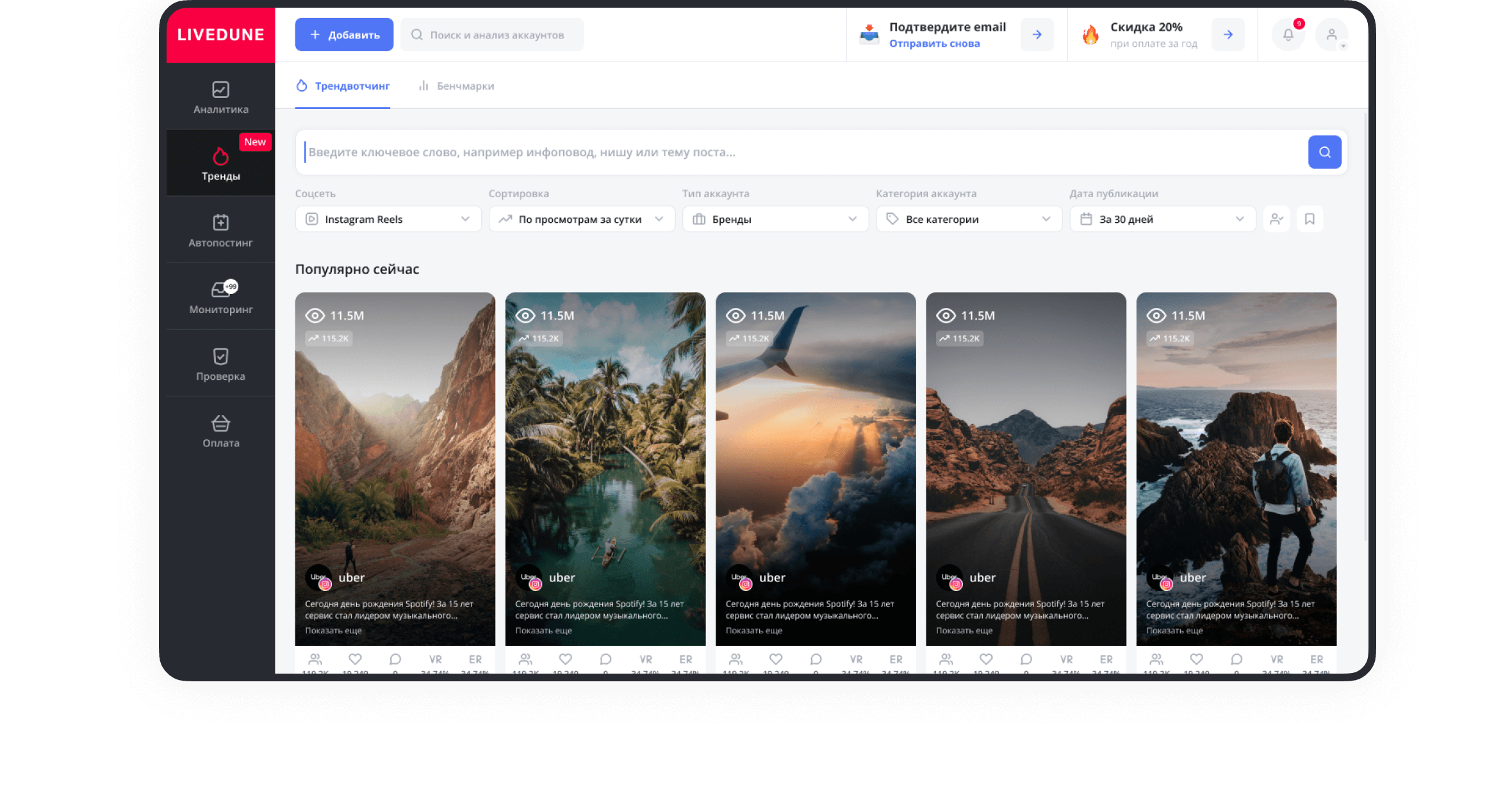 Livedune — приятная находка на бурном рынке онлайн сервисов. Команда слушает своих клиентов, идёт навстречу при разработке функционала, который нужен как частным лицам — новичкам, так и агентствам. По сути, если вы в SMM серьезно и надолго, то инструмент незаменим, так как помогает делать отчетность, доказывать свои результаты перед клиентами и, конечно, находить инсайты. На данный момент по цена/качество этот сервис вне конкуренции на рынке СНГ