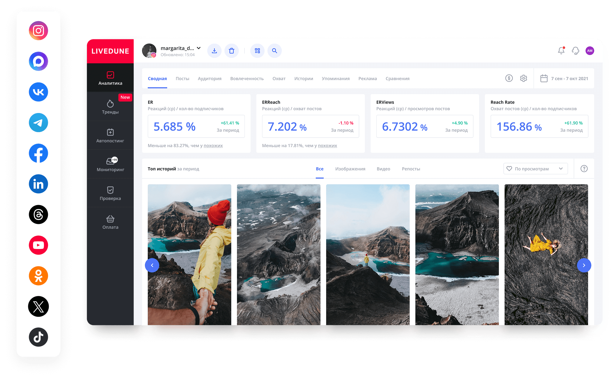 Пользуюсь Лайвдюн больше 2х лет, он стал незаменимым помощником для работы с Инстаграмом: детальная статистика аккаунта в целом и отдельно постов и сторис, возможность отследить динамику за любой период и скорректировать контент и в общем стратегию соцсетей — без сервиса никак не справилась бы! Несмотря на постоянные релизы похожих сервисов, Лайвдюн — ванлав!